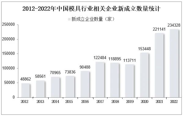 2022年全球模具行業(yè)規(guī)模超過2.1萬億元人民幣,中國模具行業(yè)市場規(guī)模超過3200億元人民幣。從行業(yè)競爭格局來看,模具行業(yè)屬于大行業(yè),2012年-2022年,國內(nèi)模具行業(yè)相關(guān)企業(yè)新成立數(shù)量由48862家增長到234328家。【本文數(shù)據(jù)、圖表來源:華經(jīng)產(chǎn)業(yè)研究院、鳳凰網(wǎng)】