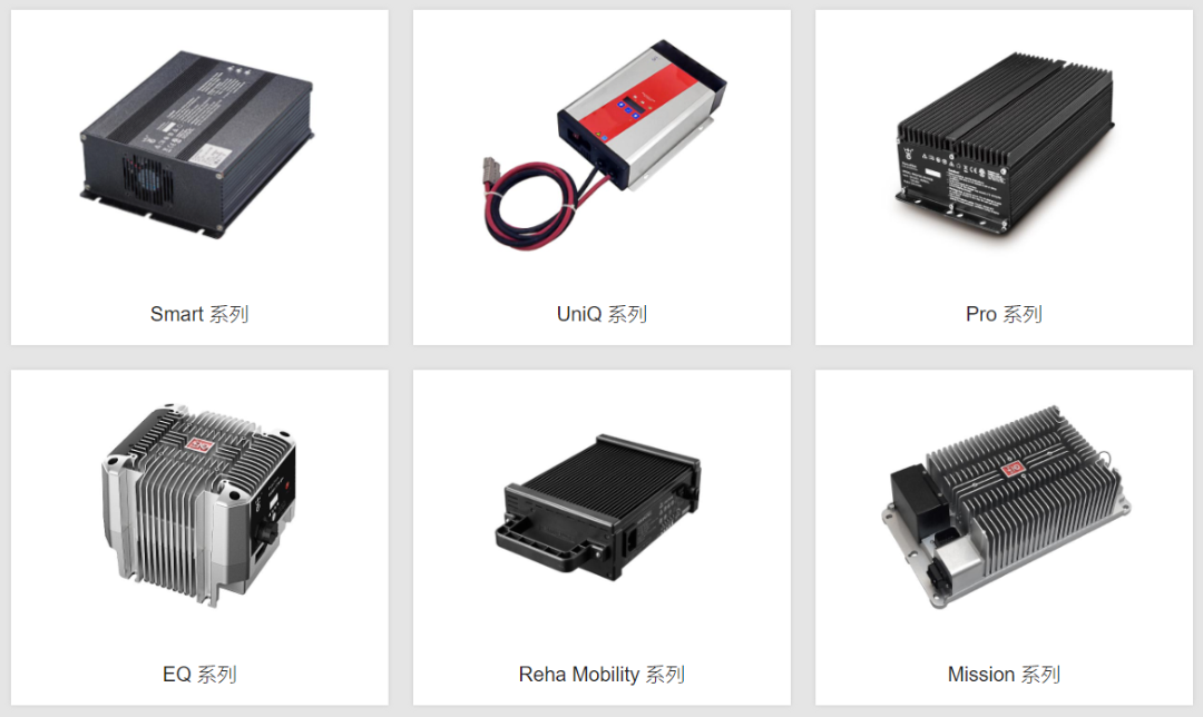 除此之外的主要標(biāo)準(zhǔn)品充電器有7大系列:Smart系列、UniQ系列、Pro系列、 EQ系列、Reha系列、Mission系列和N系列,全面覆蓋工程機(jī)械、高空作業(yè)平臺(tái),環(huán)衛(wèi)清潔車、洗地機(jī)、掃地機(jī)、AGV、機(jī)器人、輪椅、代步車、觀光車、物流叉車、園藝護(hù)理設(shè)備、農(nóng)用機(jī)械、機(jī)場地勤設(shè)備等領(lǐng)域以電池為動(dòng)力的設(shè)備和低速車的充電。