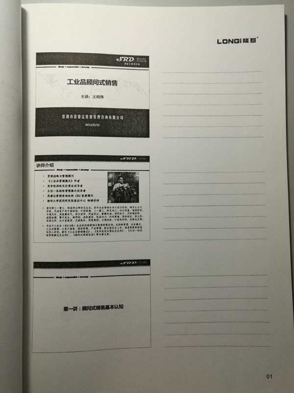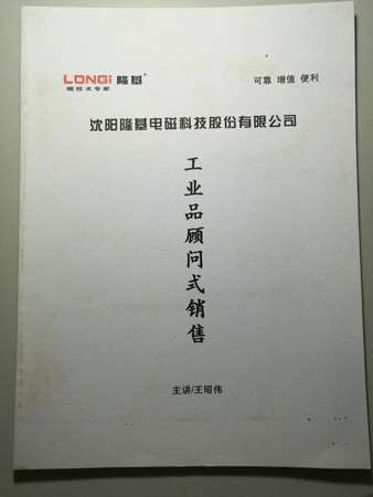 2013年10月7日,應(yīng)沈陽(yáng)隆基電磁科技股份有限公司領(lǐng)導(dǎo)邀請(qǐng),為隆基電磁培訓(xùn)《工業(yè)品顧問(wèn)式銷(xiāo)售》,與隆基營(yíng)銷(xiāo)團(tuán)隊(duì)100余人交流分享了工業(yè)品銷(xiāo)售相關(guān)技能。