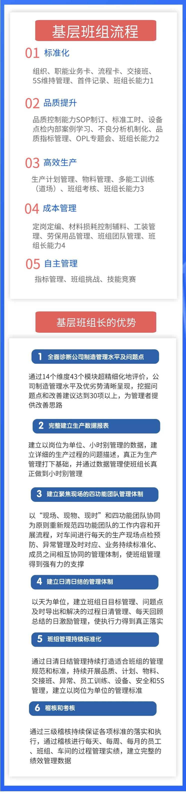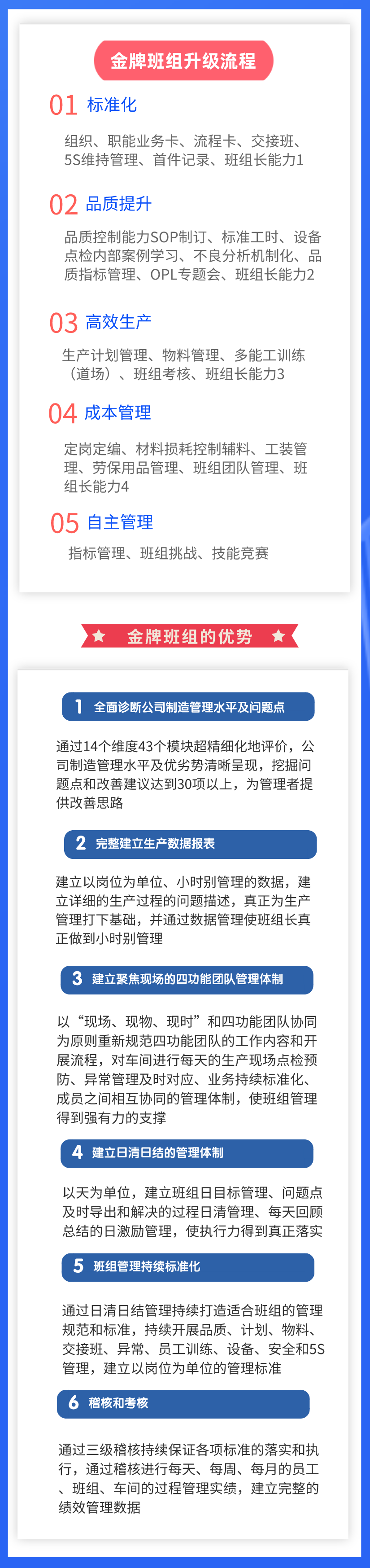 遠(yuǎn)大咨詢集團(tuán)根據(jù)100多家企業(yè)服務(wù)經(jīng)驗(yàn)開發(fā)基層班組管理咨詢產(chǎn)品。以推進(jìn)班組管理各方面業(yè)務(wù)的標(biāo)準(zhǔn)化開始,從班組管理規(guī)范化開始,逐步推進(jìn)班組的品質(zhì)管理能力,效率管理能力,成本管理能力,逐步達(dá)到班組自主管理的程度。