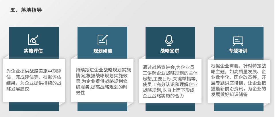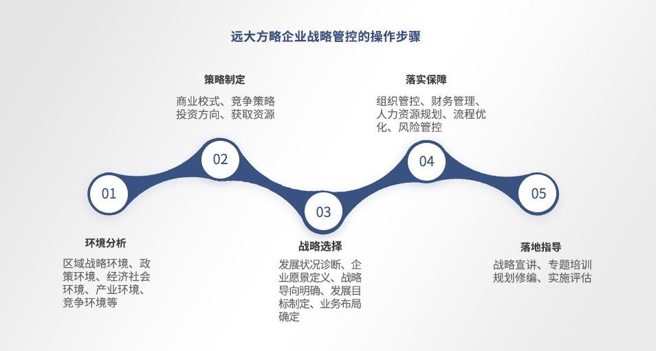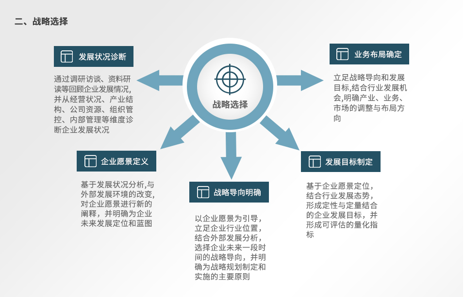 面臨未來更為復(fù)雜的發(fā)展環(huán)境,遠(yuǎn)大方略將從環(huán)境分析、戰(zhàn)略選擇、策略制定、落實(shí)保障、落地指導(dǎo)等方面幫助客戶形成完整的戰(zhàn)略管理體系并推動落地實(shí)施。