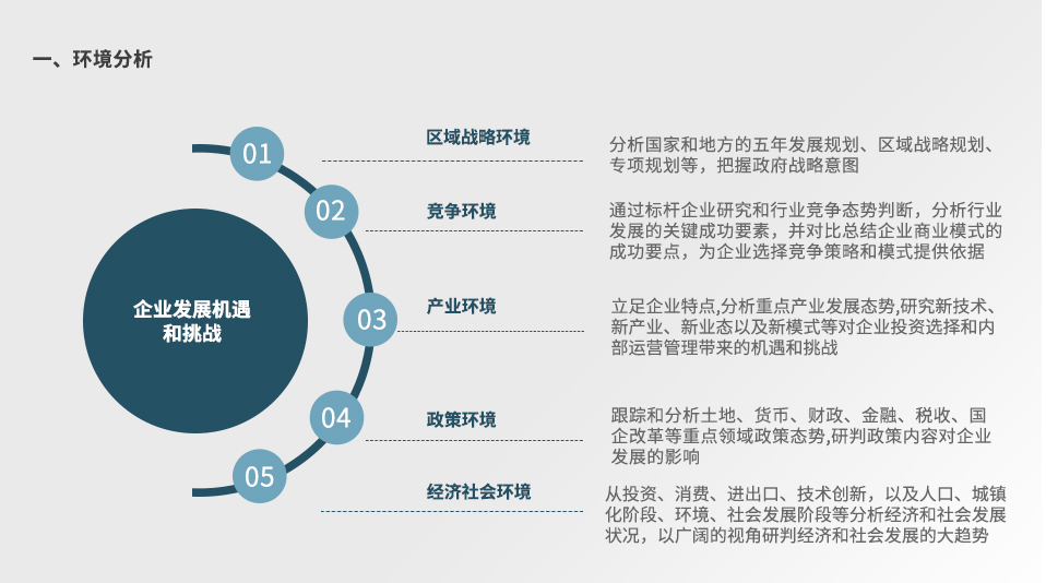 面對全球經(jīng)濟(jì)不確定性的加劇與人口紅利的消退,中國經(jīng)濟(jì)增長將從要素驅(qū)動與投資驅(qū)動,轉(zhuǎn)向創(chuàng)新驅(qū)動。為了應(yīng)對未來我國經(jīng)濟(jì)和社會發(fā)展的變化,尋求新的發(fā)展機(jī)遇,在市場競爭中占據(jù)優(yōu)勢,企業(yè)需要準(zhǔn)確研判區(qū)域戰(zhàn)略環(huán)境、政策環(huán)境、經(jīng)濟(jì)社會環(huán)境、產(chǎn)業(yè)環(huán)境、競爭環(huán)境等,根據(jù)自身發(fā)展現(xiàn)狀,明確企業(yè)愿景、戰(zhàn)略導(dǎo)向、發(fā)展目標(biāo)和業(yè)務(wù)布局方向,從商業(yè)模式、競爭策略、投資方向、資源獲取等方面規(guī)劃發(fā)展戰(zhàn)略,并為戰(zhàn)略落實(shí)構(gòu)建合理的戰(zhàn)略保障體系。