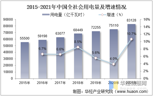電力行業(yè)是電線(xiàn)電纜行業(yè)最主要的應(yīng)用領(lǐng)域,近年來(lái),我國(guó)全社會(huì)用電量不斷增長(zhǎng),推動(dòng)了我國(guó)電線(xiàn)電纜需求的增長(zhǎng)。據(jù)資料顯示,2021年我國(guó)全社會(huì)用電量達(dá)83128億千瓦時(shí),同比增長(zhǎng)10.7%。