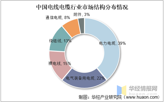 從我國(guó)電線(xiàn)電纜市場(chǎng)結(jié)構(gòu)來(lái)看,目前,電力電纜是行業(yè)市場(chǎng)占比最大的細(xì)分領(lǐng)域,占比達(dá)39%,其次為電器裝備用電纜和裸電線(xiàn),占比分別為22%和15%。