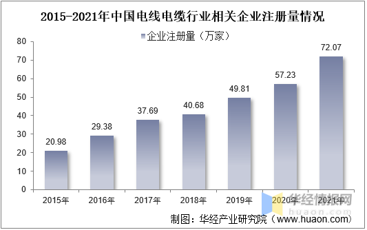 隨著我國(guó)電線(xiàn)電纜行業(yè)的快速發(fā)展,行業(yè)新增企業(yè)數(shù)量不斷增長(zhǎng)。據(jù)資料顯示,截至2021年底,我國(guó)電線(xiàn)電纜行業(yè)相關(guān)企業(yè)注冊(cè)量達(dá)72.07萬(wàn)家,同比增長(zhǎng)25.9%。