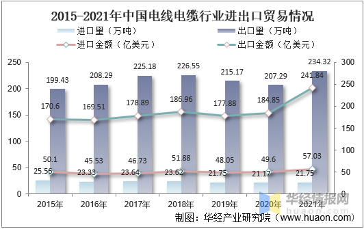 從行業(yè)進(jìn)出口貿(mào)易情況來(lái)看,我國(guó)電線(xiàn)電纜主要以出口為主。據(jù)資料顯示,2021年我國(guó)電線(xiàn)電纜進(jìn)口量為21.75萬(wàn)噸,同比增長(zhǎng)2.7%,進(jìn)口金額為57.03億美元,同比增長(zhǎng)15%;出口量為234.32萬(wàn)噸,同比增長(zhǎng)13%,出口金額為241.84億美元,同比增長(zhǎng)30.8%。