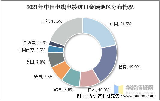 從進(jìn)口分布情況來(lái)看,2021年我國(guó)電線(xiàn)電纜進(jìn)口金額中,占比前三的地區(qū)分別為中國(guó)、越南和日本,占比分別為21.5%、19.9%和10%。