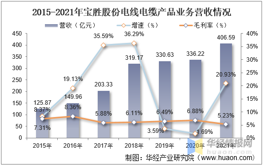 寶勝科技創(chuàng)新股份有限公司(簡(jiǎn)稱(chēng)寶勝股份)是中國(guó)航空工業(yè)集團(tuán)公司旗下的上市公司,公司主要從事電線(xiàn)電纜及電纜附件開(kāi)發(fā)、制造、銷(xiāo)售及相關(guān)的生產(chǎn)技術(shù)開(kāi)發(fā)。公司產(chǎn)品覆蓋裸導(dǎo)體、電氣裝備用電纜、電力電纜、通信電纜及光纜等,是我國(guó)電線(xiàn)電纜行業(yè)主要龍頭企業(yè)之一。據(jù)資料顯示,2021年寶勝股份電線(xiàn)電纜產(chǎn)品業(yè)務(wù)營(yíng)收為406.59億元,同比增長(zhǎng)20.93%,毛利率為5.23%。