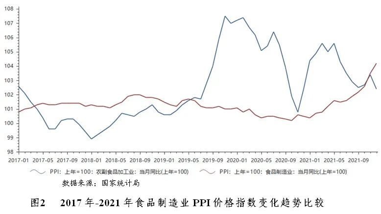 由于成本端原材料、包材、運(yùn)費(fèi)齊漲,產(chǎn)業(yè)鏈利潤被擠壓,2021年食品制造業(yè)出廠價(jià)格呈現(xiàn)上漲趨勢。國家統(tǒng)計(jì)局?jǐn)?shù)據(jù)顯示,2021年食品制造業(yè)工業(yè)生產(chǎn)者出廠價(jià)格指數(shù)為104.20,農(nóng)副食品制造業(yè)工業(yè)生產(chǎn)者出廠價(jià)格指數(shù)為102.4,表明食品價(jià)格較2020年同期略有增長。在“疫情”之下,食品作為剛需產(chǎn)品,需求下降不明顯,價(jià)格并未受到較大影響。