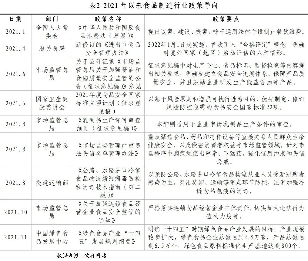 2021年,我國宏觀政策效應(yīng)持續(xù)顯現(xiàn)為食品制造行業(yè)帶來積極作用,行業(yè)監(jiān)管政策主要圍繞加強(qiáng)食品安全監(jiān)管和推動產(chǎn)業(yè)健康有序地向高質(zhì)量發(fā)展。