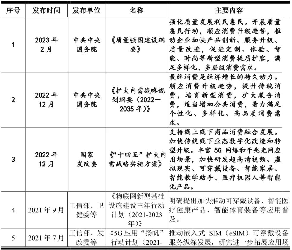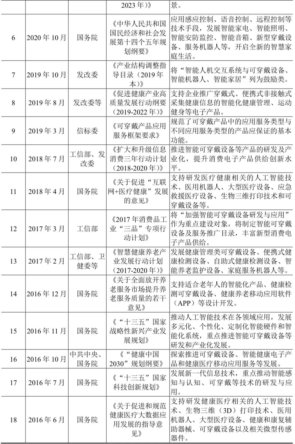 智能可穿戴設(shè)備行業(yè)作為國(guó)家鼓勵(lì)和支持的產(chǎn)業(yè),近幾年來(lái), 相關(guān)政府部門先后出臺(tái)多項(xiàng)產(chǎn)業(yè)政策支持和鼓勵(lì)其發(fā)展。涉及的主要產(chǎn)業(yè)政策 如下表所示: