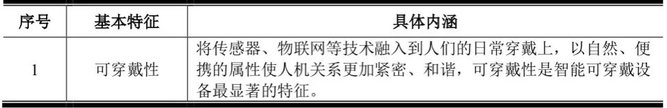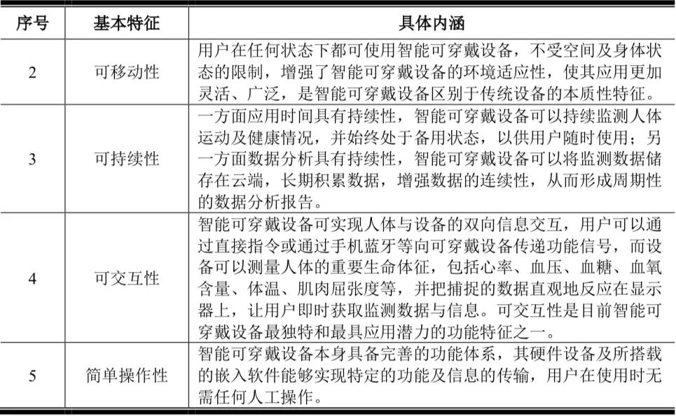 智能可穿戴設(shè)備是物聯(lián)網(wǎng)技術(shù)、移動(dòng)互聯(lián)網(wǎng)、云存儲(chǔ)技術(shù)和大數(shù)據(jù)技術(shù)不斷融合創(chuàng)新的最佳載體,具有可穿戴性、可移動(dòng)性、可持續(xù)性、可交互性以及簡(jiǎn)單操作性五大基本特征,各個(gè)特征的具體內(nèi)涵如下表所示: