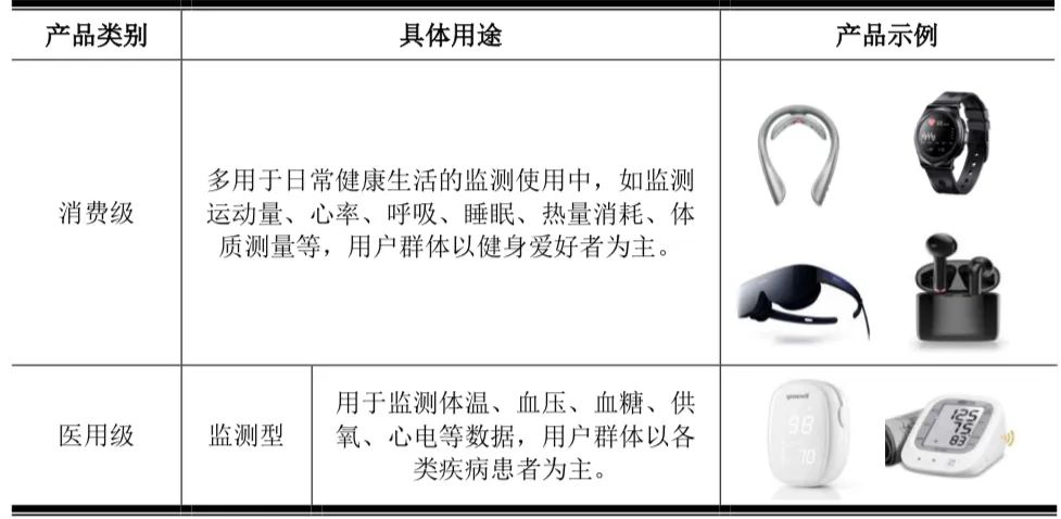 而從產(chǎn)品的性質(zhì)來(lái)看,智能可穿戴設(shè)備主要分為消費(fèi)級(jí)智能可穿戴設(shè)備和醫(yī)用級(jí)智能可穿戴設(shè)備。消費(fèi)級(jí)智能可穿戴設(shè)備主要針對(duì)普通人群,通過(guò)運(yùn)動(dòng)監(jiān)測(cè)、肌肉放松、康復(fù)理療等方式實(shí)現(xiàn)用戶的自我健康管理和健康狀況改善,代表性產(chǎn)品包括健康手表、可穿戴按摩儀、智能腕帶等常見(jiàn)產(chǎn)品,以及智能服裝、書包、鞋襪等各類非主流產(chǎn)品形態(tài);而醫(yī)用級(jí)智能可穿戴設(shè)備主要服務(wù)對(duì)象為各類疾病患者人群,為特定疾病患者人群提供監(jiān)測(cè)防范和對(duì)慢性病患者人群進(jìn)行治療指導(dǎo),代表性產(chǎn)品有血壓計(jì)、血糖儀、血脂檢測(cè)儀、可穿戴心率除顫器等。