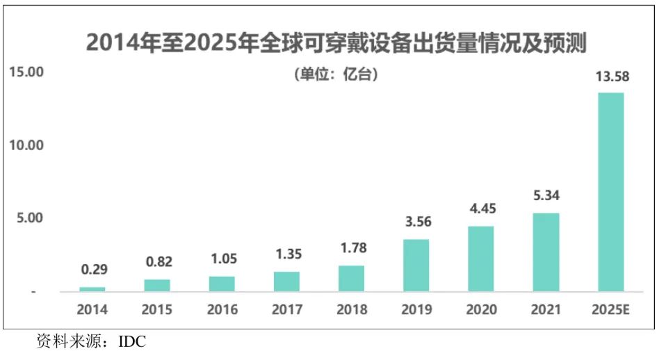 全球智能可穿戴設(shè)備出貨量持續(xù)保持強(qiáng)勁增長(zhǎng)。據(jù) IDC 統(tǒng)計(jì)數(shù)據(jù)顯示,全球智能可穿戴設(shè)備總出貨量 2014 年-2021 年復(fù)合增長(zhǎng)率為 51.69%,其中,2020 年全球智能可穿戴設(shè)備出貨量為 4.45 億臺(tái),同比增長(zhǎng) 25.00%;2021 年全球智能可穿戴設(shè)備出貨量為 5.34 億臺(tái),同比增長(zhǎng) 20%;預(yù)計(jì) 2021-2025 年全球智能可穿戴設(shè)備出貨量復(fù)合增長(zhǎng)率約為 26.28%,2025 年預(yù)計(jì)出貨量將達(dá)到 13.58 億臺(tái)。