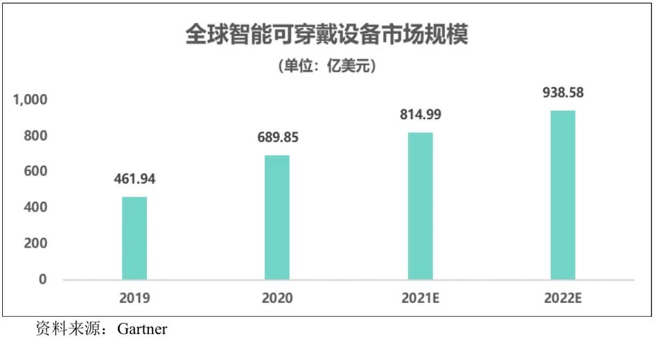 據(jù) Gartner 預(yù)測(cè),到 2022 年全球消費(fèi)者在智能可穿戴設(shè)備上的支出合計(jì)可達(dá)到 938.58 億美元,較 2019 年將增長(zhǎng) 476.64 億美元,三年間實(shí)現(xiàn)近 100%的增幅。