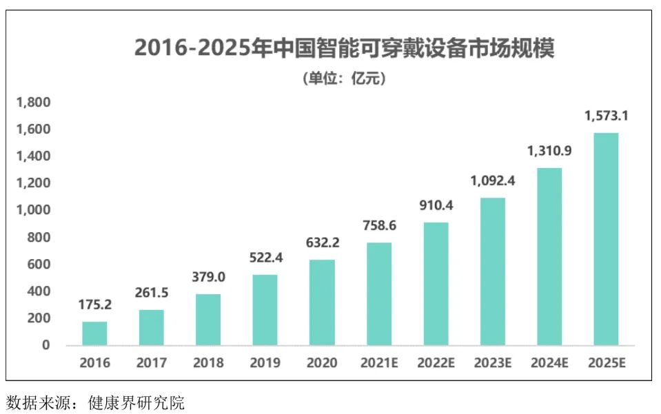 近年來(lái),隨著社會(huì)經(jīng)濟(jì)的發(fā)展與居民可支配收入不斷提高,居民的購(gòu)買力逐漸增強(qiáng),良好的經(jīng)濟(jì)環(huán)境推動(dòng)了我國(guó)智能可穿戴設(shè)備的普及。2016-2020 年我國(guó)智能可穿戴設(shè)備行業(yè)市場(chǎng)規(guī)模由 175.2 億元增長(zhǎng)至 632.2 億元,年復(fù)合增長(zhǎng)率為 37.8%。伴隨著未來(lái)居民健康的意識(shí)的進(jìn)一步提升,以及行業(yè)相關(guān)技術(shù)的進(jìn)一步優(yōu)化,我國(guó)智能可穿戴設(shè)備行業(yè)將擁有更為廣闊的市場(chǎng)增長(zhǎng)空間,預(yù)計(jì) 2025 年我國(guó)智能可穿戴設(shè)備行業(yè)市場(chǎng)規(guī)模將達(dá) 1,573.1 億元。