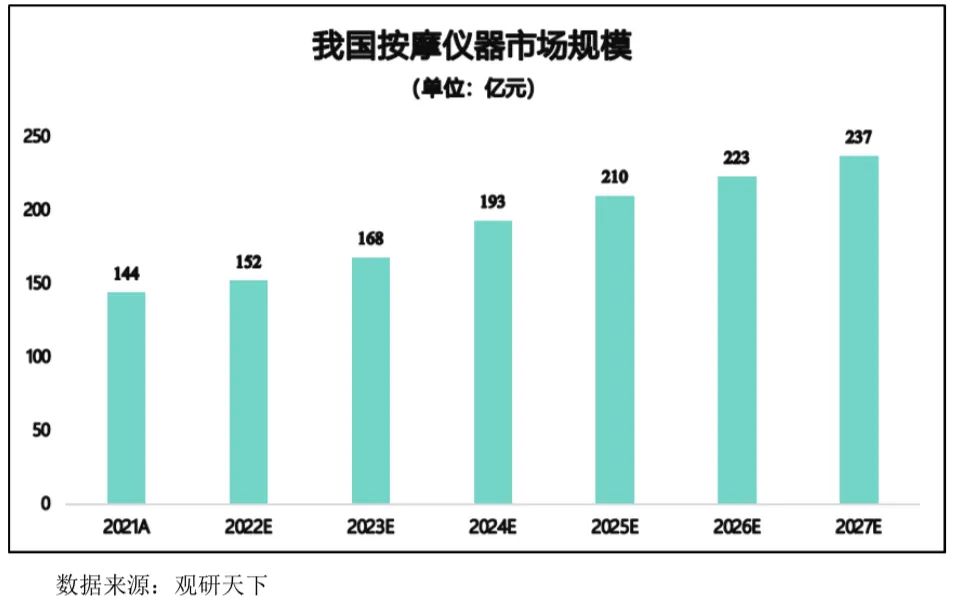 隨著經(jīng)濟(jì)的不斷發(fā)展、人們生活水平的日益提高,在消費(fèi)觀念和消費(fèi)水平轉(zhuǎn)變與提升的背景下,按摩儀器行業(yè)得以快速發(fā)展。而隨著電子技術(shù)的進(jìn)步和新材料的應(yīng)用,按摩裝置實(shí)現(xiàn)了精確化和小型化控制,用戶體驗(yàn)的優(yōu)化也進(jìn)一步推動(dòng)了按摩儀器的市場(chǎng)發(fā)展。根據(jù)觀研天下數(shù)據(jù),2021 年我國(guó)按摩儀器市場(chǎng)規(guī)模達(dá)到 144 億元,預(yù)計(jì)于 2027 年將增長(zhǎng)至 237 億元,年均復(fù)合增長(zhǎng)率達(dá)到 8.65%。