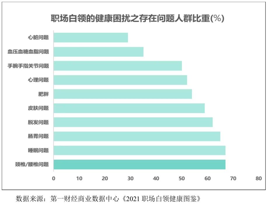 近年來(lái),經(jīng)濟(jì)水平的逐步提高使得人們生活節(jié)奏不斷加快,高強(qiáng)度的工作導(dǎo)致職場(chǎng)人士容易進(jìn)入亞健康狀態(tài),長(zhǎng)期受到頸椎、腰椎及血液循環(huán)不暢等慢性病的困擾。據(jù)《2022 年國(guó)民健康洞察報(bào)告》顯示,在 70 前、70 后、80 后、90 后、95 后、00 后這六個(gè)年齡段的人群里,95 后健康自評(píng)分最低,00 后近一年健康困擾數(shù)量最多,中青年健康問(wèn)題日益凸顯。