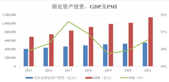 在供需改善的背景下,國內(nèi)制造業(yè)景氣度自 2015 年底起觸底回升。同時中國工業(yè)企業(yè)設(shè)備能力利用水平、固定資產(chǎn)投資情況自 2016 年開始穩(wěn)步增長,制 造業(yè)景氣度繼續(xù)上行。2020 年受新冠疫情影響,GDP 增速大幅下降,PMI 小幅提高。2021 年在疫情防控常態(tài)化下,內(nèi)需穩(wěn)步恢復(fù)、外貿(mào)快速增長,GDP 增速重回高位,PMI 上升至榮枯分水線之上,顯示出經(jīng)濟(jì)擴張的訊號。