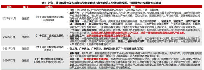 從國家政策上看,2020年7月發(fā)布了《關(guān)于推動智能建造與建筑工業(yè)化協(xié)同發(fā)展的指導意見》;2021年2月發(fā)布了《關(guān)于同意開展智能建造試點的函》;2022年1月發(fā)布了《“十四五”建筑業(yè)發(fā)展規(guī)劃》;2022年11月發(fā)布了《關(guān)于公布智能建造試點城市的通知》。住建部正在穩(wěn)步推進智能建造,“十四五”建筑業(yè)發(fā)展規(guī)劃提出要求裝配式建筑占新建建筑的比例達到 30%以上,培育一批智能建造和裝配式建筑產(chǎn)業(yè)基地,裝配式建筑將成為主要的發(fā)力點。在“雙碳”的背景之下,建筑行業(yè)作為“碳排放大戶”,“碳達峰”任務的主要抓手,擁有碳減排的空間極大,將會成為節(jié)能減排的重要節(jié)點。