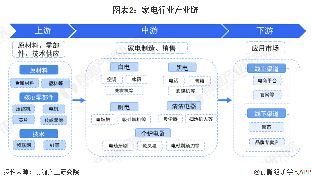 家電產(chǎn)品的生產(chǎn)需要使用金屬、塑料等原材料和各類電子元器件、壓縮機(jī)、電機(jī)、芯片等零部件,按照產(chǎn)品設(shè)計(jì)方案和一定的工作流程對(duì)上述原材料和零配件進(jìn)行加工、組裝,產(chǎn)出產(chǎn)品后通過一定的銷售渠道銷售給客戶。隨著智能家電的發(fā)展,家電行業(yè)對(duì)于上游物聯(lián)網(wǎng)、人工智能等技術(shù)需求也在增長(zhǎng),新技術(shù)正在塑造新的家電產(chǎn)業(yè)鏈。