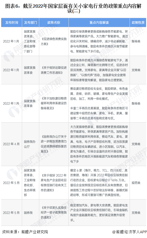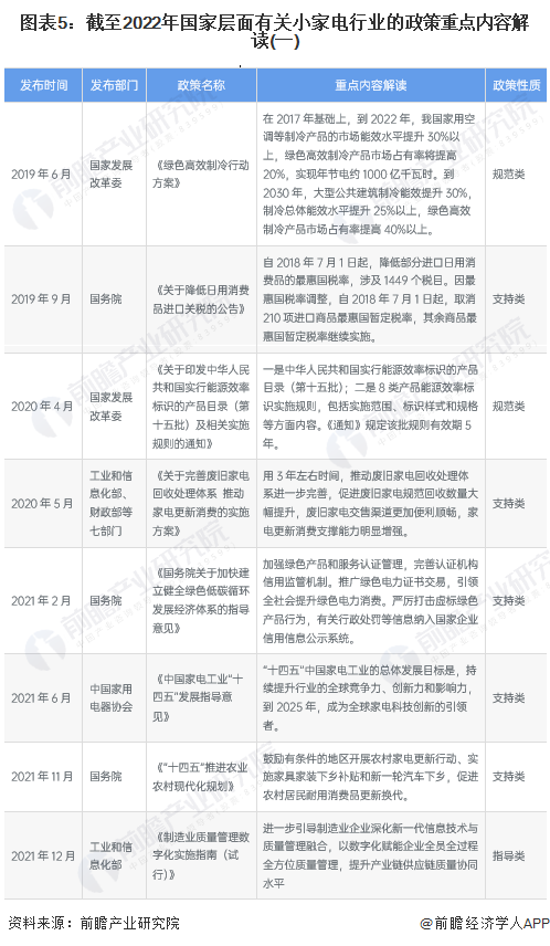 2022年1月,國家發(fā)改委擬定《關(guān)于做好近期促進消費工作的通知》,鼓勵有條件的地方開展綠色智能家電下鄉(xiāng),通過企業(yè)讓利、降低首付比例等方式,促進農(nóng)村居民消費。支持家電、家具等企業(yè)開展“以舊換新”、“以換代棄”活動,加強家電安全使用年限標準等宣傳解讀,鼓勵家電合理更新。2022年一季度,中國境內(nèi)零星爆發(fā)新型冠狀肺炎疫情導致經(jīng)濟增長受阻,國務(wù)院也于2022年5月制定了一攬子穩(wěn)住經(jīng)濟的政策措施,其中提及穩(wěn)定家電產(chǎn)品的消費??偨Y(jié)梳理來看,近年來國家層面對于小家電行業(yè)的政策關(guān)鍵詞在于:新一輪家電下鄉(xiāng)、以舊換新、補貼消費、家電回收。