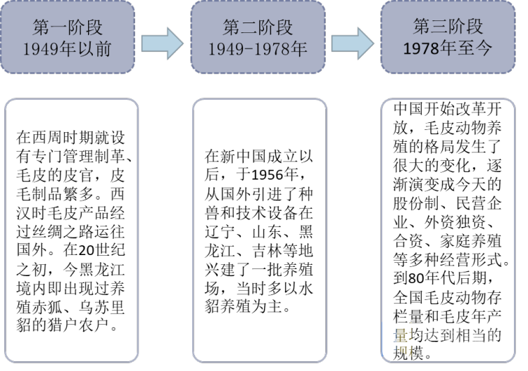 我國(guó)毛皮行業(yè)發(fā)展較早,早在西周時(shí)期就設(shè)有專門(mén)管理制革、毛皮的皮官,皮毛制品繁多。西漢時(shí)毛皮產(chǎn)品經(jīng)過(guò)絲綢之路運(yùn)往國(guó)外。在20世紀(jì)之初,今黑龍江境內(nèi)即出現(xiàn)過(guò)養(yǎng)殖赤狐、烏蘇里貂的獵戶農(nóng)戶。而在新中國(guó)成立以后,于1956年,從國(guó)外引進(jìn)了種獸和技術(shù)設(shè)備在遼寧、山東、黑龍江、吉林等地興建了一批養(yǎng)殖場(chǎng),當(dāng)時(shí)多以水貂養(yǎng)殖為主。1978年,中國(guó)開(kāi)始改革開(kāi)放,毛皮動(dòng)物養(yǎng)殖的格局發(fā)生了很大的變化,逐漸演變成今天的股份制、民營(yíng)企業(yè)、外資獨(dú)資、合資、家庭養(yǎng)殖等多種經(jīng)營(yíng)形式。到80年代后期,全國(guó)毛皮動(dòng)物存欄量和毛皮年產(chǎn)量均達(dá)到相當(dāng)?shù)囊?guī)模。