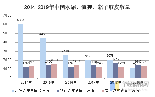 通常應(yīng)用的毛皮有羊、兔、狗等,比較名貴的有狐貍、貉子、水貂毛皮等,常用做大衣、帽子、圍巾的材料,比較厚重的毛皮如熊、狼的毛皮一般作為褥子、掛毯等材料。2019年中國(guó)水貂、狐貍、貉子取皮數(shù)量分別為1169萬(wàn)張、1443萬(wàn)張、1359萬(wàn)張。