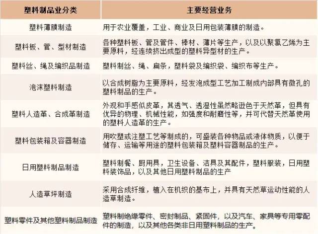 塑料制品業(yè)又稱塑料加工業(yè),系我國(guó)輕工業(yè)的支柱產(chǎn)業(yè)之一,與我國(guó)國(guó)民經(jīng)濟(jì)發(fā)展息息相關(guān)。根據(jù)加工工藝和產(chǎn)品細(xì)分領(lǐng)域的不同,塑料制品業(yè)又可分為:塑料薄膜制造;塑料板、管、型材制造;塑料絲、繩及編織品制造;泡沫塑料制造;塑料人造革、合成革制造;塑料包裝箱及容器制造;日用塑料制品制造;人造草坪制造;塑料零件及其他塑料制品制造。