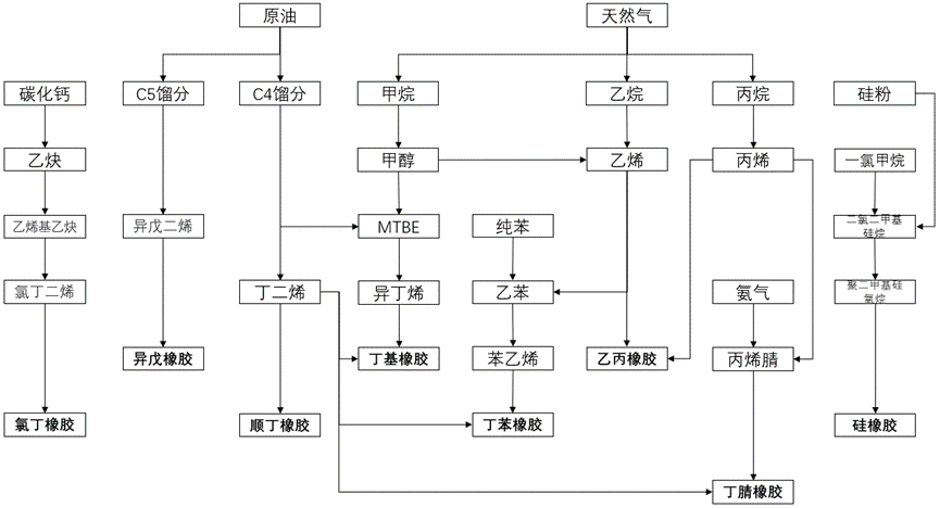 合成橡膠主要生產(chǎn)原料為丁二烯,原料端來看,第一種工藝路徑是從原油出發(fā),通過石腦油裂解工藝獲得混合C4,并從中抽提丁二烯。第二種工藝路徑是從天然氣出發(fā),通過乙烷制乙烯裂解裝置副產(chǎn)混合C4,并從中抽提丁二烯。除丁二烯外,合成橡膠生產(chǎn)原料包括苯乙烯、異丁烯、異戊二烯、丙烯腈等多種單體中間物。