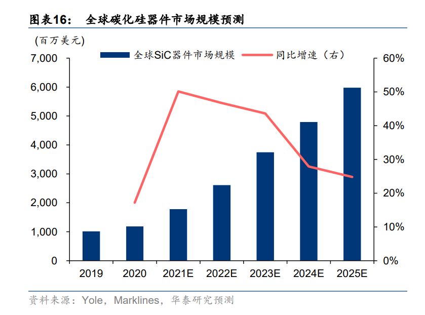 2020 年全球 SiC 器件市場(chǎng)規(guī)模達(dá) 11.84 億美元,預(yù)計(jì)到 2025 年有望增長(zhǎng)至 59.79 億美元,對(duì)應(yīng)復(fù)合年均增長(zhǎng)率為 38.2%。根據(jù)測(cè)算,在碳中和趨勢(shì)下,受益于 SiC 在新能源汽車、光 伏、風(fēng)電、工控等領(lǐng)域的持續(xù)滲透,SiC 功率器件市場(chǎng)規(guī)模有望從 2020 年的 2.92 億美元增長(zhǎng)至 2025 年的 38.58 億美元,對(duì)應(yīng)復(fù)合年均增長(zhǎng)率為 67.6%;以及在5G通信、下游SiC功率及射頻器件高速增長(zhǎng)的需求也將帶動(dòng) SiC 材料市場(chǎng)規(guī)??焖俪砷L(zhǎng)。