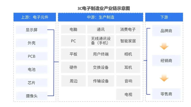3C電子制造業(yè)產(chǎn)業(yè)鏈由上中下游組成,上游主要是包含顯示屏、外殼、PCB等各類電子元件,中游主要是各類產(chǎn)品的生產(chǎn)制造,如電腦、平板、耳機(jī)等;下游主要包含由品牌商、經(jīng)銷商以及零售商;3C電子產(chǎn)品的市場需求的增加,也將促進(jìn)上中下游整個產(chǎn)業(yè)鏈各個環(huán)節(jié)的需求增加。