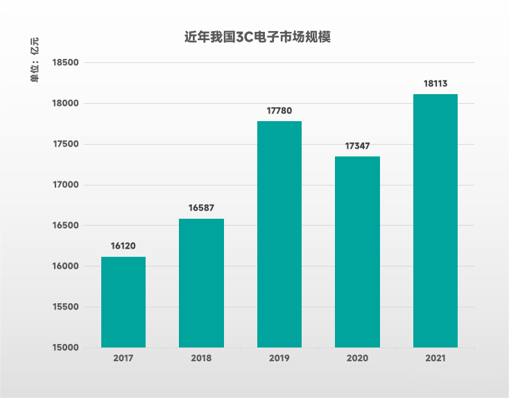 2017-2021年,我國3C電子市場的規(guī)模整體呈擴(kuò)大之勢,從16120億元增長至18113億元,除2020年受國民經(jīng)濟(jì)下行、消費(fèi)市場整體走弱影響而略有回落外,其余年份皆保持上升。其中,2017-2021年各年份增長率為2.9%、7.2%、-2.4%、4.4%,表明國內(nèi)3C市場運(yùn)行較為穩(wěn)健,行業(yè)整體處于健康有序發(fā)展?fàn)顟B(tài)。