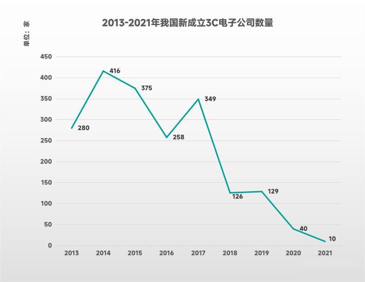 2013-2017年是我國新成立3C電子公司的短暫集中期,年均成立數(shù)量超過300家;步入2018年后,由于行業(yè)成熟度與技術(shù)壁壘持續(xù)提高,新成立3C公司數(shù)量快速降至126家;疫情期間行業(yè)新進(jìn)入規(guī)模進(jìn)一步壓縮,2020年為40家,2021年則僅余10家。