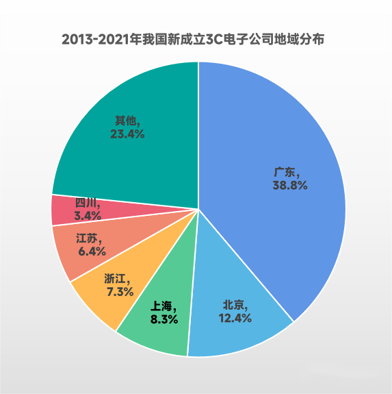 2013-2021年我國新成立3C公司地域分布中,廣東省以38.8%的占比拔得頭籌,遠(yuǎn)超排名二三的北京(12.4%)、上海(8.3%)等地區(qū)。