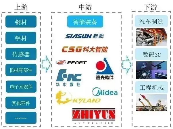 中國重點推進(jìn)高檔數(shù)控機(jī)床與基礎(chǔ)制造裝備,自動化成套生產(chǎn)線,智能控制系統(tǒng),精密和智能儀器儀表與試驗設(shè)備,關(guān)鍵基礎(chǔ)零部件、元器件及通用部件,智能專用裝備的發(fā)展。智能裝備產(chǎn)業(yè)鏈上游主要是鋼材、鋁材、重要零件等,中游為智能裝備產(chǎn)業(yè),下游為智能裝備的應(yīng)用,智能裝備主要的應(yīng)用領(lǐng)域主要包括汽車制造、數(shù)碼3C、工程機(jī)械。