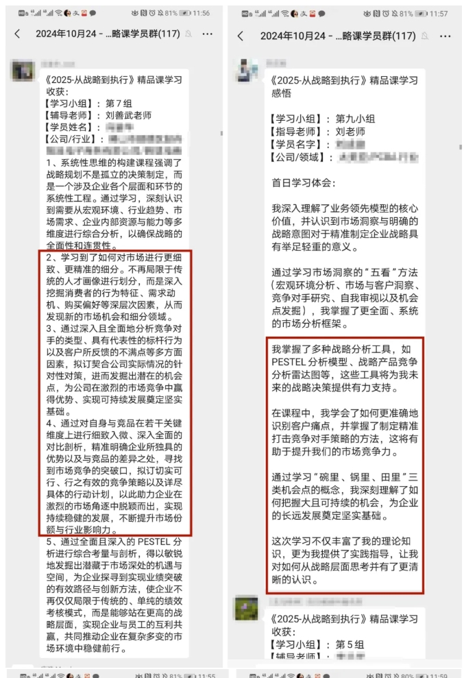 參加此次課程的學(xué)員超百人,來自不同行業(yè)不同企業(yè)的企業(yè)家、高管,更有部分企業(yè)組團(tuán)前來學(xué)習(xí),剖析差距原因,識(shí)別增長機(jī)會(huì),達(dá)成戰(zhàn)略共識(shí),助力企業(yè)長效增長。白天的高能課程讓企業(yè)受益匪淺,結(jié)束一天的課程之后,企業(yè)老板都自發(fā)的帶著自己的團(tuán)隊(duì)留下來繼續(xù)深化企業(yè)的戰(zhàn)略方案,從而實(shí)現(xiàn)從0到1的戰(zhàn)略規(guī)劃落地。