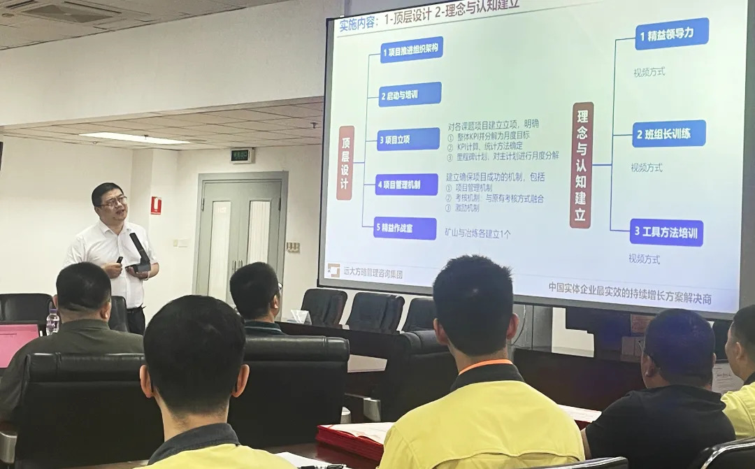 啟動(dòng)會(huì)上,項(xiàng)目組老師首先向中冶瑞木對遠(yuǎn)大方略的信任表示感謝,老師介紹了項(xiàng)目的頂層設(shè)計(jì),先對整體框架和關(guān)鍵要素進(jìn)行明確和規(guī)劃,主要包括項(xiàng)目推進(jìn)組織架構(gòu),啟動(dòng)與培訓(xùn),項(xiàng)目立項(xiàng)、項(xiàng)目管理機(jī)制以及精益作戰(zhàn)室。項(xiàng)目能否成功落地除了框架的建立,理念與認(rèn)知的建立也是十分重要,要對大家進(jìn)行相關(guān)培訓(xùn),包括精益領(lǐng)導(dǎo)力、班組長訓(xùn)練以及工具方法培訓(xùn),提升認(rèn)知,掌握理論才能更好地落地實(shí)踐。