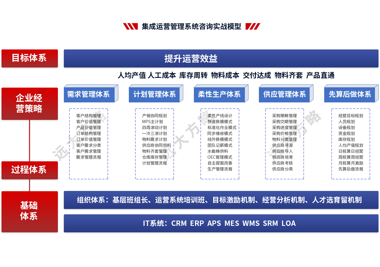 2、輔導(dǎo)模塊:推行卓越運(yùn)營(yíng)管理,主要從戰(zhàn)略規(guī)劃與經(jīng)營(yíng)計(jì)劃、組織架構(gòu)優(yōu)化與責(zé)權(quán)利系統(tǒng)構(gòu)建、核心業(yè)務(wù)流程梳理、目標(biāo)與數(shù)據(jù)信息體系構(gòu)建、 自主運(yùn)營(yíng)體系構(gòu)建等方面做改善